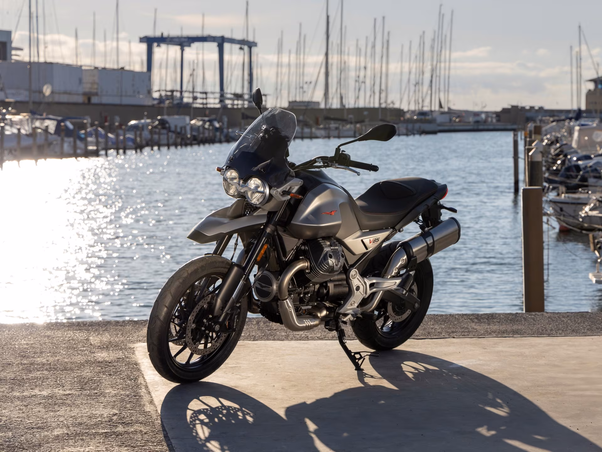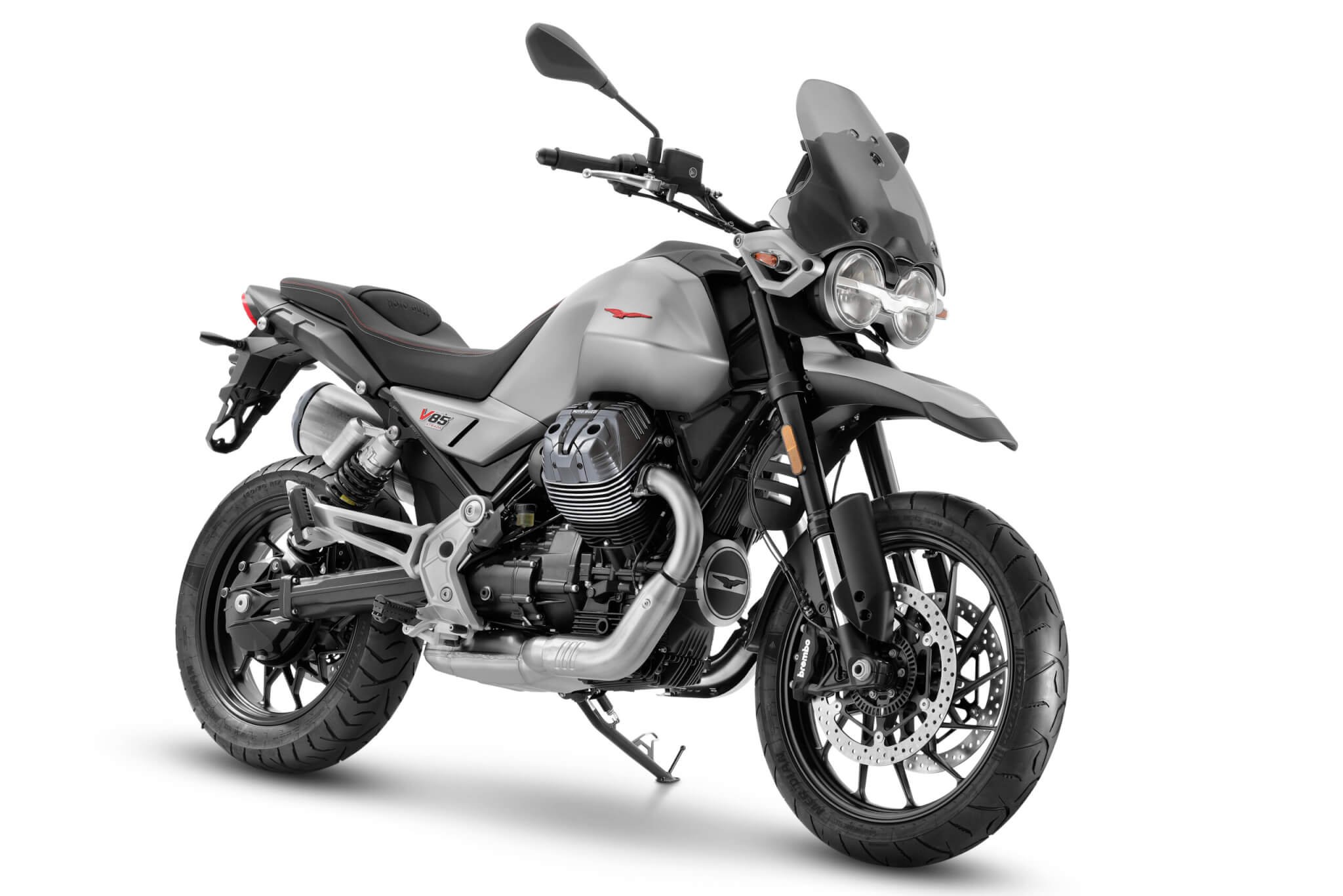 Minimalist, clean, and confident, the V85 Strada features a sleeker, more essential aesthetic. With alloy wheels, a smaller front fender, and street-oriented tires, it’s built for the asphalt while retaining the signature silhouette of the V85 range. The exposed transverse V-twin engine, high-mounted exhaust, and compact cockpit give it a classic-meets-modern look that’s unmistakably Guzzi.